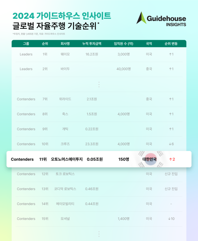 오토노머스에이투지 가이드하우스 인사이트 2024 글로벌 자율주행 기술 순위 11위 기록, 오토노머스에이투지 제공.