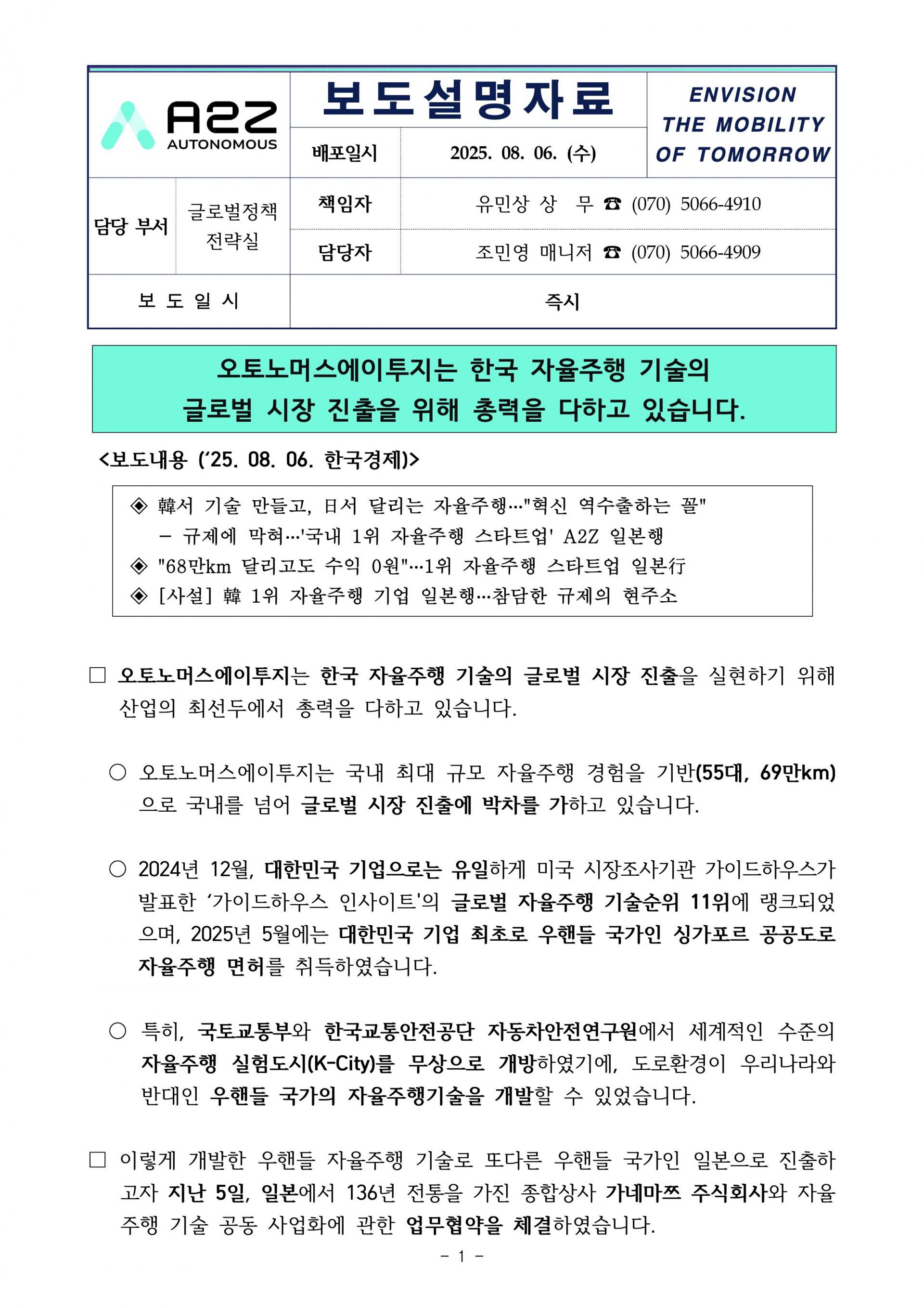 공지 [보도설명자료] 오토노머스에이투지 일본 진출 관련 언론보도에 대한 설명